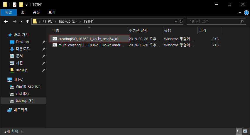 다운로드 받은 cmd 파일은 폴더에 몰아 넣고 관리자 권한으로 실행 합니다. 전 1번 통합되는 iso 만드는 cmd를 실행 해보겠습니다. 꼭 관리자 권한으로 실행 해주세요. 오른쪽 마우스 누루고 관리자 권한으로 실행 ~