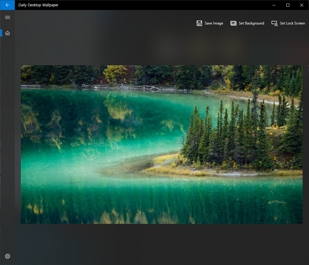 홈화면에서 해당 이미지를 클릭하면 그 이미지를 바로 저장할 수도 있고, 그걸 바탕화면, 로그인화면으로 바로 바꿀수도 있네요. 아래화며에서 오른쪽위에 Save Image, Set Background, Set Lock Screen 요걸루 설정이 됩니다. 편하네요.