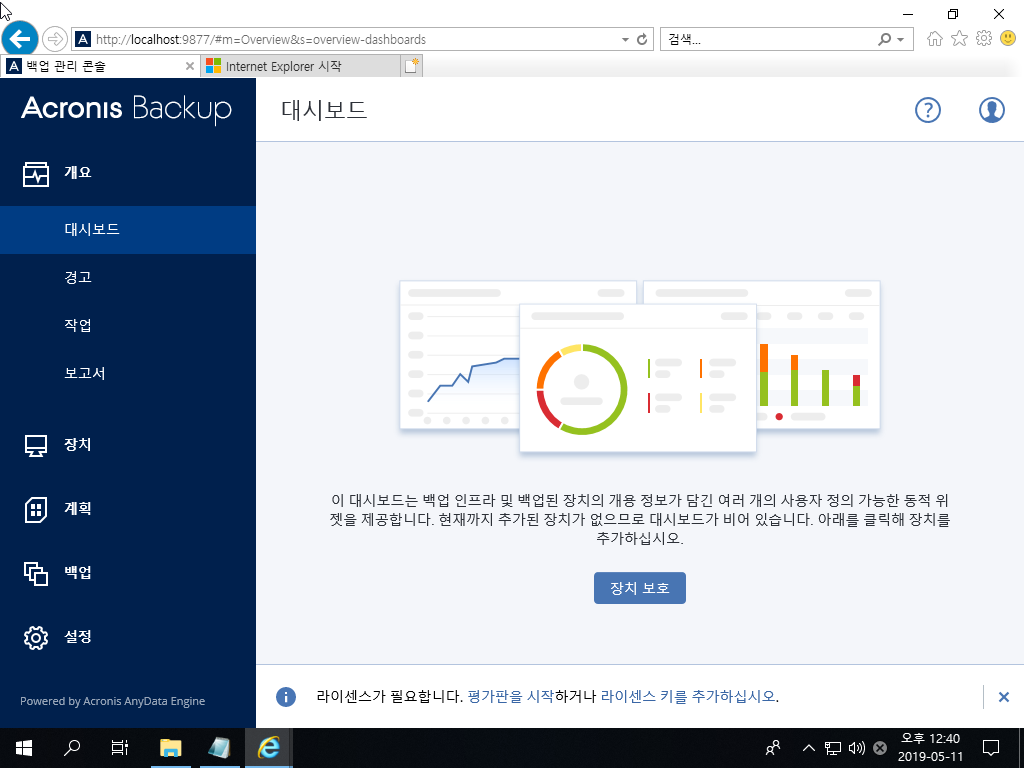 5. 관리 콘솔 화면입니다. 로그인 하자마자 대시보드에 현재 장치 보호되고 있는 에인전트 현황이 나옵니다. 현재 등록이 안되있어 없기 때문에 화면에 보여지지는 않습니다. 아래에 보시면 "라이센스가 필요합니다. 라이센스키를 추가하여 주십시오" 문구가 나옵니다. 발급 받은 라이센스키를 입력합니다. 키를 입력하면 페이지를 다시 로드 할거냐고 물어보며 "지금 다시로드"를 눌러주시면 됩니다.
