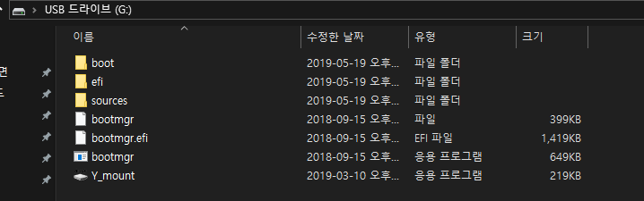 아래 화면은 USB메모리 입니다. 여기서 boot efi sources 폴더 통째로 지워주세요.