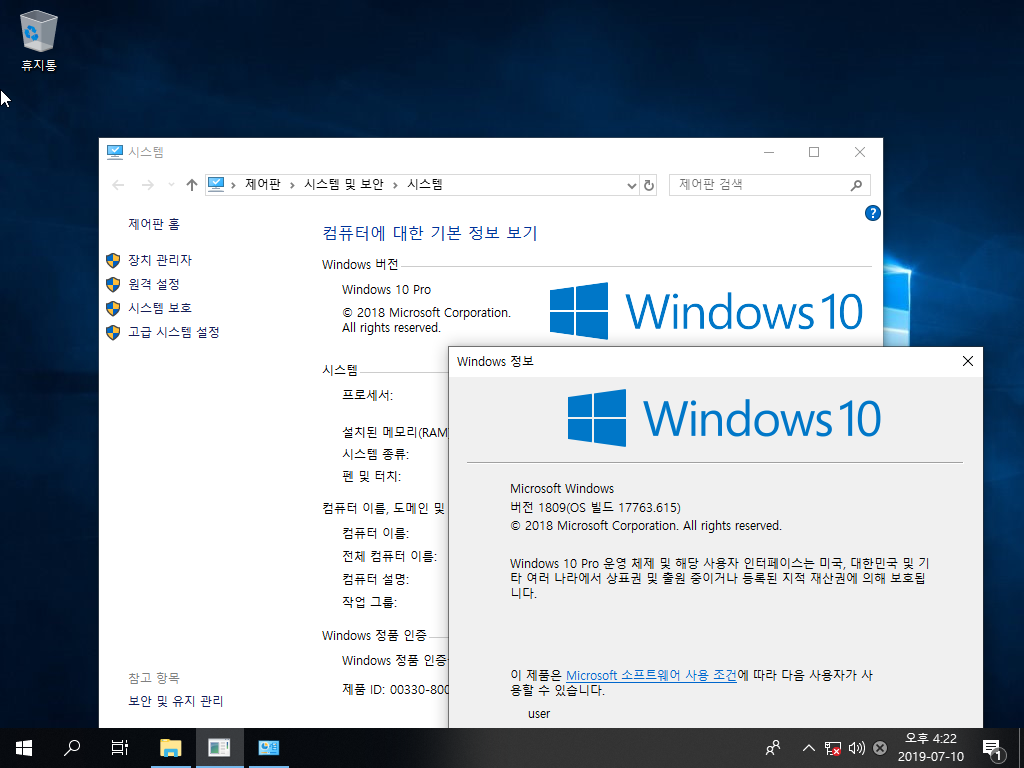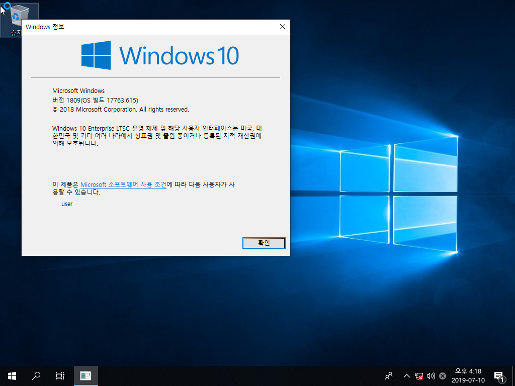 그림1. LTSC 입니다. 2019년 7월 정기 업데이트 통합판으로 설치했습니다.