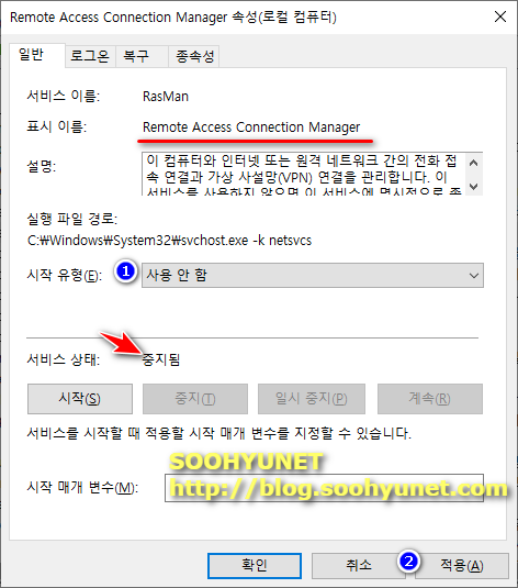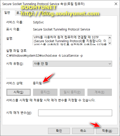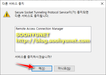 서비스 리스트에서 Secure Socket Tunneling Protocol Service 를 찾은 후 아래 그림 순서대로 중지를 누룹니다.