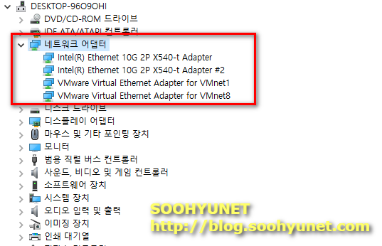 사설이 좀 길어 졌구요. 윈도우를 설치 했습니다. 장치 드라이버를 열어보니 네트워크 어댑터 항목에 이상하게 너무 많이 잡혀 있습니다. 와.. 내 네트워크 어뎁터가 이리 많았나... 아래 화면처럼 많이 잡혀 있을것입니다.