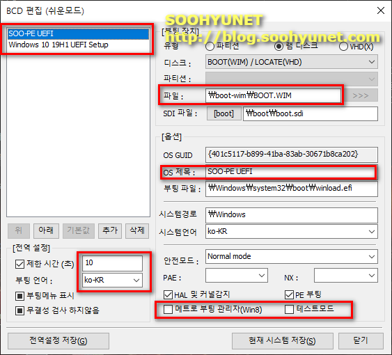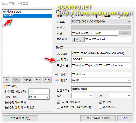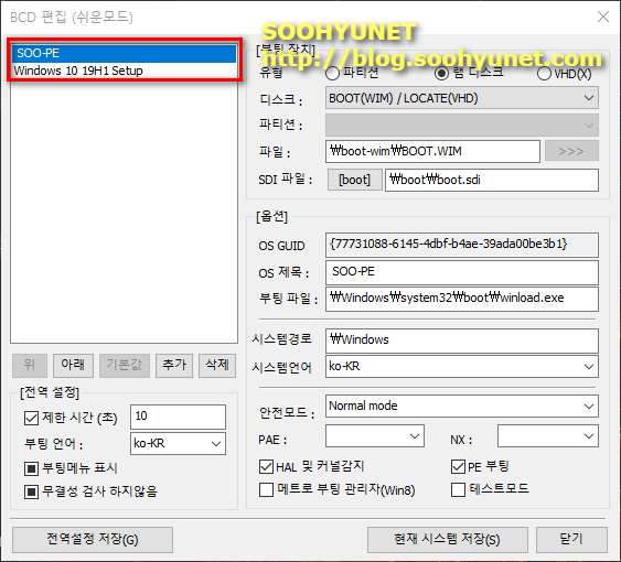 잘 변경이 되었네요. SOO-PE를 기본으로 변경하고 싶다면 SOO-PE 기본값으로 변경 하시면 됩니다. windows Setup라고 되어있는 부팅 항목의 변경을 원하면 windows setup를 Windows 10 19H1 Setup 이라고 변경 하셔도 됩니다.