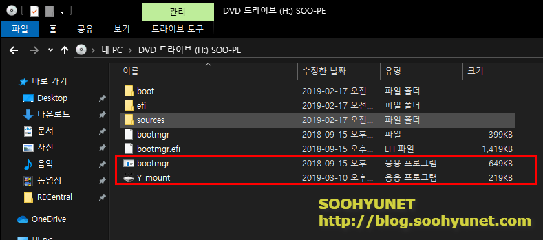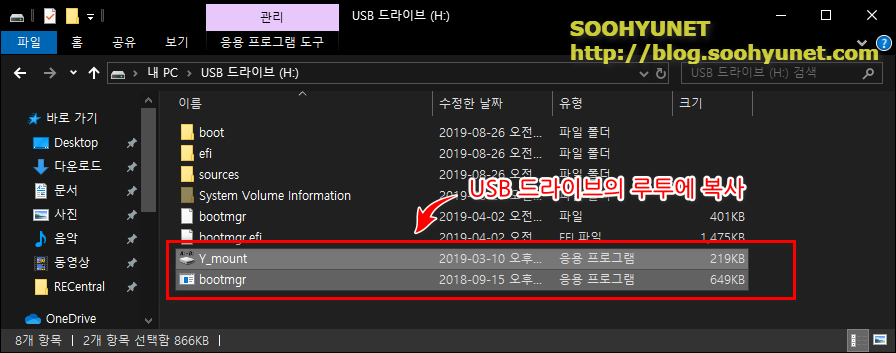 아래와 같은 리스트가 보입니다. bootmgr.exe 파일과 Y_mount 파일이 더 추가로 있네요. 이 두개 파일을 USB 메모리 스틱의 Root(루트)에 복사합니다.