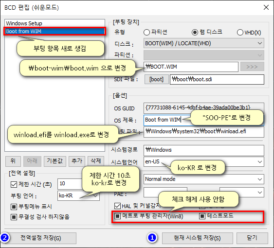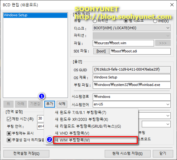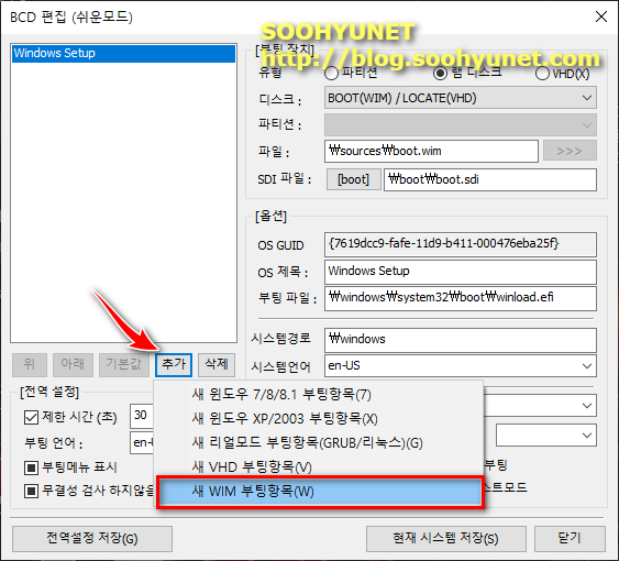 새 WIM 부팅항목을 이전과 같이 추가 해줍니다.