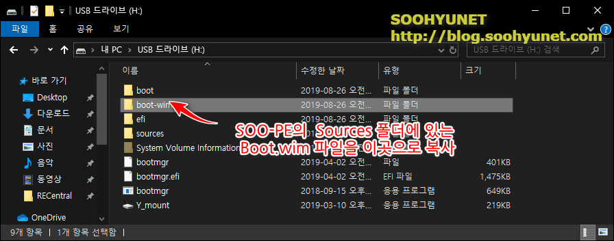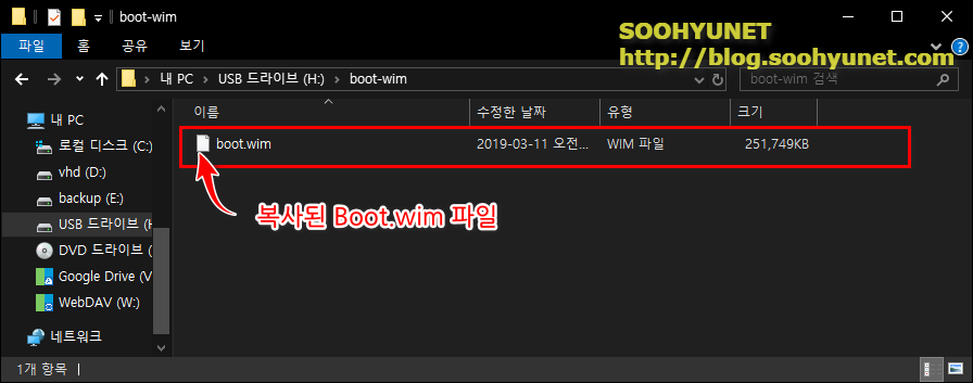 USB드라이브 sources 폴더에도 boot.wim 파일이 있으니 같은 곳에 넣으면 안됩니다. 폴더를 하나 생성 해서 넣어 보도록 하겠습니다. boot-wim 이라는 폴더를 하나 생성해서 그안데 SOO-PE의 Sources 폴더에 있는 boot.wim 파일을 복사해서 넣겠습니다.