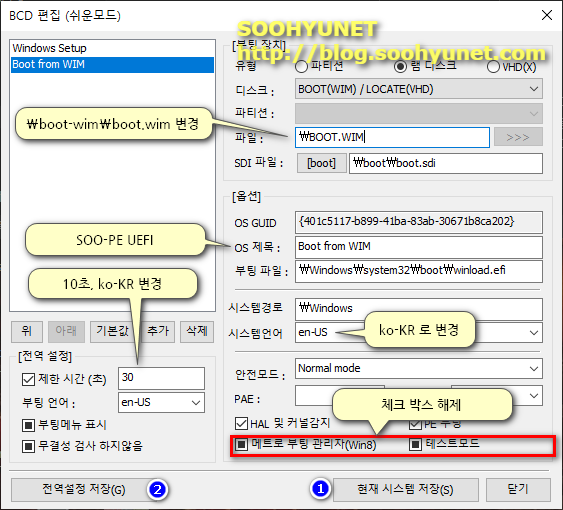 아래 화면처럼 부팅항목이 새로 생기며, 해당 경로를 풍선 도움말 내용과 똑같이 수정합니다. 수정후 현재 시스템 저장 버튼을 눌러 주세요.