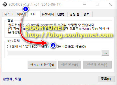 상단메뉴에서 BCD를 선택합니다. 그리고 다른 BCD 파일 라디오 버튼을 선택합니다.
