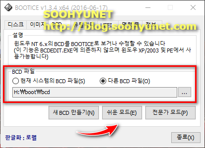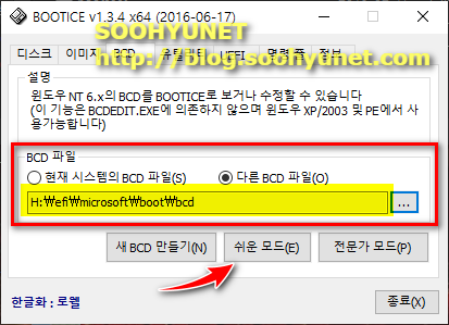 bcd 편집에 사용되는 툴은 여러가지가 있으나 bootice가 젤 일반적으로 많이 쓰입니다. 저두 애용하는 프로그램입니다. BCD를 수정해야 할곳은 두곳입니다.